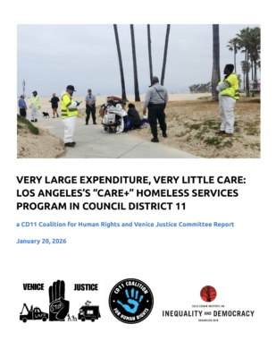 The City of Los Angeles states that the “primary mission” of the Comprehensive Cleaning and Rapid Engagement (CARE+) program is to “deliver services to the individuals experiencing homelessness within their service areas.” While CARE+ costs taxpayers tens of millions of dollars each year, not even including law enforcement, what does this budget translate into on the ground? Conducted by the CD11 Coalition for Human Rights and Venice Justice Committee, Very Large Expenditure, Very Little Care: Los Angeles’ “CARE+” Homeless Services Program in Council District 11 reports findings from repeat observation of CARE+ operations in Venice, a related survey of unhoused persons about displacement and outreach, and a review of Councilmember Traci Park’s communications about CARE+ and homeless encampments. The report finds that CARE+ employs a large number of City staff and equipment to displace and dispossess unhoused people, with little to no outreach for shelter or housing. While the local councilmember celebrates removing encampments and vehicle dwellings with little to no mention of the people living there, it is worth re-considering how well CARE+ matches the City’s priorities for homeless services. As such, the report provides policy recommendations to accomplish neighborhood cleaning while still supporting unhoused people.